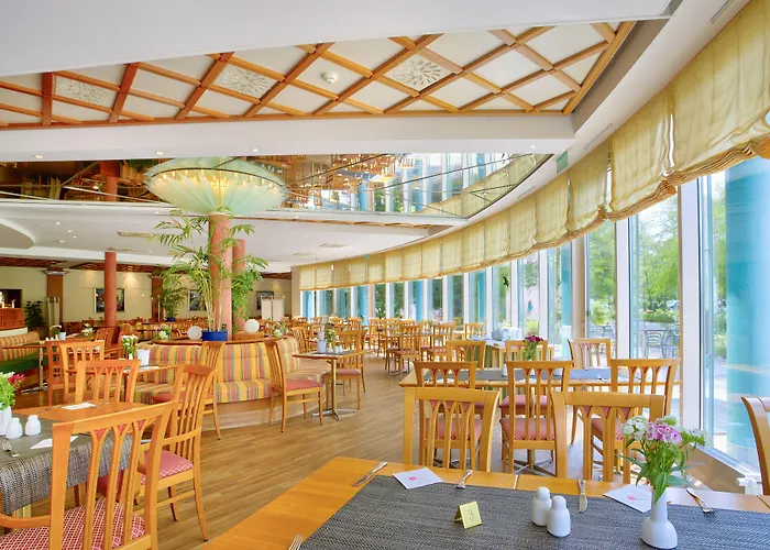 Das Michel Hotel serviert Frühstücksbuffet im Restaurant. Das À-la-carte- Restaurant Seepark bietet auf seiner Speisekarte Gerichte der internationalen Küche. Die Gäste können sich auch in der Lounge- Bar bei einem Getränk entspannen.